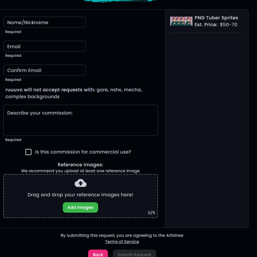 Once you select your desired style, you will be prompted to complete the request form as shown. Fill in all fields and be sure to include reference images and a detailed description of your request.I will be in contact with you to discuss and confirm details.Once we are in agreement, I will send you an invoice and accept your request formally to being work!